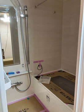 浴室セット、部屋の区割りも進んでなんとなくお部屋の感じがつかめるようになっております。